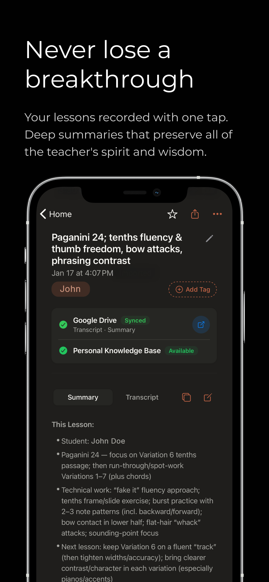 For years, I've watched profound moments disappear—both as a student and teacher. The detailed walkthrough for shaping phrases in Tchaikovsky Concerto—bow distribution, articulation, and nuances of rubato. The revelations in artistic phrasing and sound production. I collected notes, recorded myself, tried every system. Nothing worked the way I needed it to.