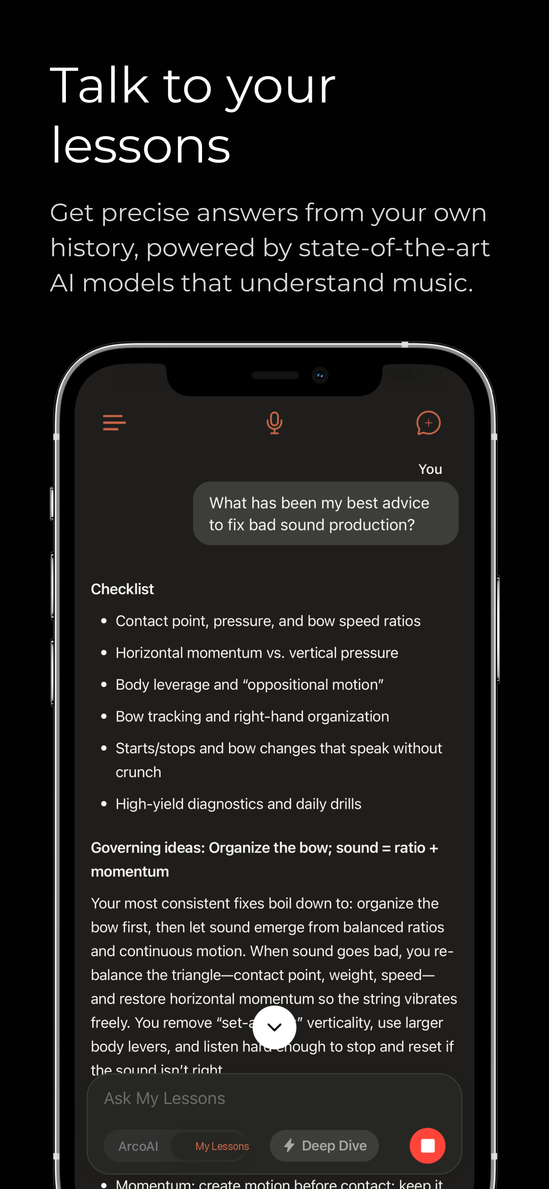 Even before your first recording—Arco is ready to talk. Ask anything about technique, interpretation, or artistry, and as your library grows, Arco can bring your own lesson history into the same conversation.